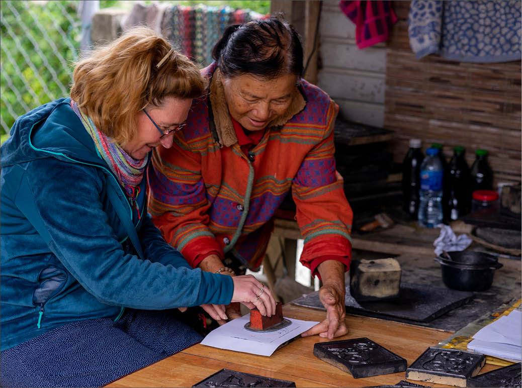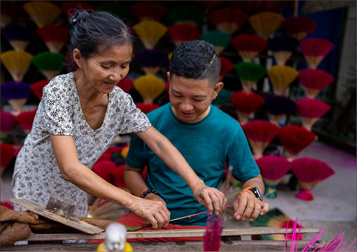 Du khách trải nghiệm in mộc bản tranh làng Sình và làm hương