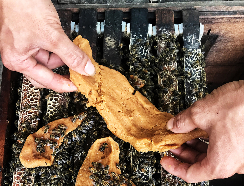 Thức ăn thêm cho ong bao gồm phấn hoa nguyên chất, bột đậu nành, một ít đường được trộn đều tạo thành những chiếc bánh đặt bề mặt của tổ