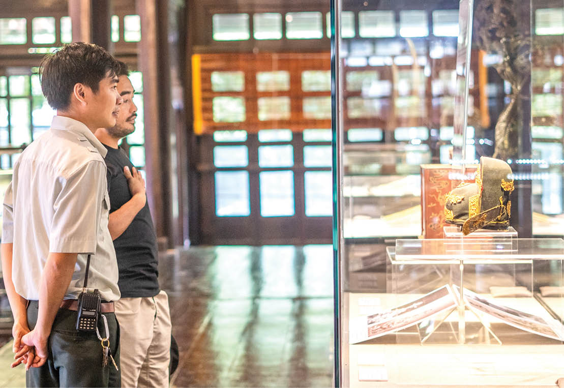 Nhân viên Bảo tàng Cổ vật cung đình Huế (bìa trái) hỗ trợ khách tham quan điện Long An