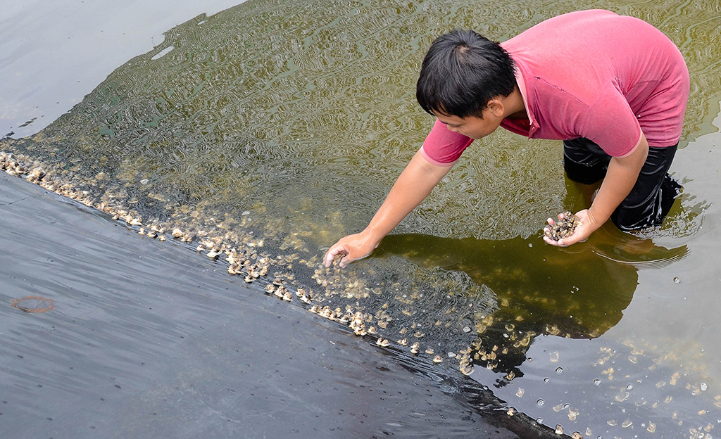 Một hồ nuôi tôm được chuyển thành hồ nuôi ốc hương khi xảy ra dịch bệnh COVID-19