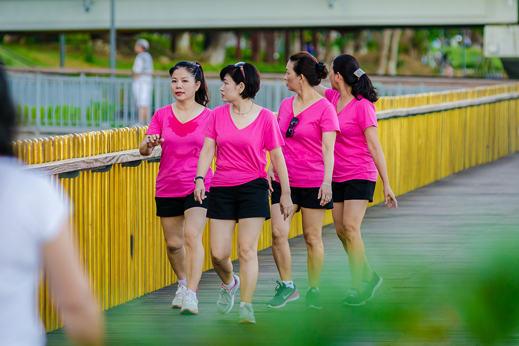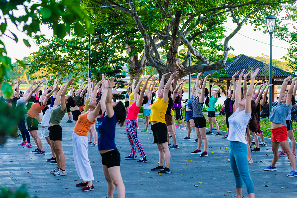 Bài tập tập thể trên công viên phía đầu cầu gỗ lim thu hút chị em