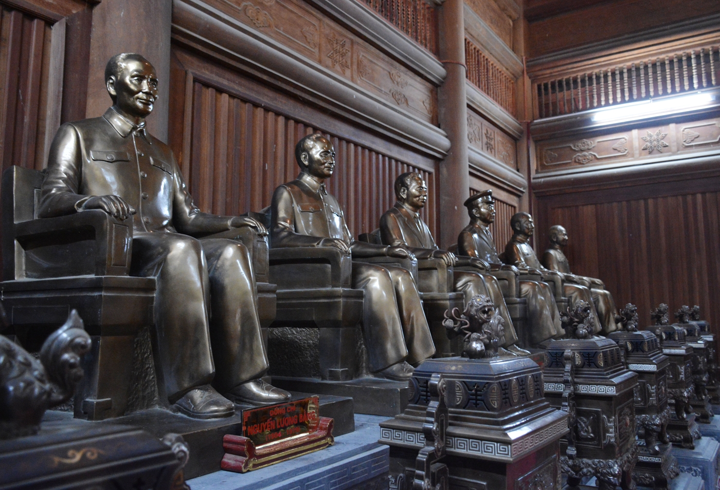 | Hai bên tả hữu đền là 14 pho tượng toàn thân của 14 vị tiền bối cách mạng. Trong số đó, quê hương Thừa Thiên Huế góp mặt 2 người con ưu tú: Đại tướng Nguyễn Chí Thanh và nhà thơ Tố Hữu. |