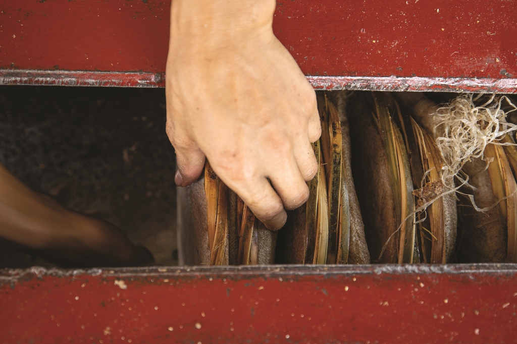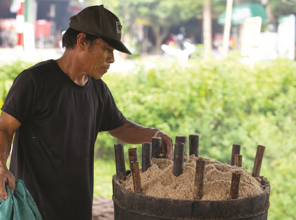 Những ống tre được xếp tạo khoảng trống để khi hấp, lạc sẽ chín đều