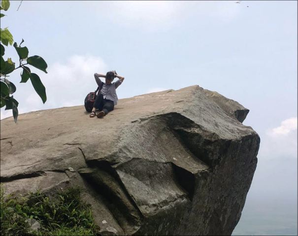2 -  Trạm nghỉ đầu tiên ở độ cao 636m thực ra là quán của ông Sáu Nhơn. Khi chúng tôi ghé vào thì Út Cam và vợ cũng ở đó. Tụi tui làm cùng ổng – Út cho hay và có vẻ mặn chuyện. Út nói ông Sáu 59 tuổi rồi, đã gả vợ gả chồng cho con rồi và có thâm niên hơn ba chục năm “cầm cự” chốn này. Kể ra thì ông Sáu trông trẻ và tráng kiện hơn tuổi của mình nhiều. "Từ đây tui đổ núi mất hơn tiếng, chứ ổng đi có 45 phút thôi hà – Út nói rồi khuyên chúng tôi leo ra tảng đá hình con rùa chông chênh bờ núi ngắm cảnh, check – in rồi xuống núi đi, trển có gì đâu mà đường lại trơn trượt, biết đâu đá còn rớt nữa". Đã chóng mặt về độ chơi vơi của tảng đá con rùa nhưng lời khuyên của người đàn ông 38 tuổi này còn làm tôi choáng hơn nữa, vì hình dung những gì đang chờ mình ở chặng tiếp theo. Hơi sợ, nhưng tôi vẫn tìm đường bò ra sự chông chênh đó kiếm vài kiểu ảnh, như một cách khẳng định “tôi đã ở đây”, dù nói thật là không dám nhìn xuống dưới đồng ruộng làng quê xa tít dưới kia. Nếu các anh chị còn ở đây đến 5h chiều, sẽ thấy dơi bay thành đàn với chiều ngang chừng 3m và phải 30 phút mới hết - Út Cam nói khi tôi quay trở lại nhâm nhi lon bò húc mát lạnh giá 15.000 đồng. Ở đây chỉ bán được cho sinh viên và dân đi phượt không hà, bán mắc ai mua - là câu trả lời từ người mắn chuyện. Nếu là tôi, chắc chai nước khoáng và tô mì tôm ăn kèm với rau tiêu núi (giống y rau càng cua ở quê mình) phải gấp mấy lần 10.000 đồng cho mỗi thứ mất...