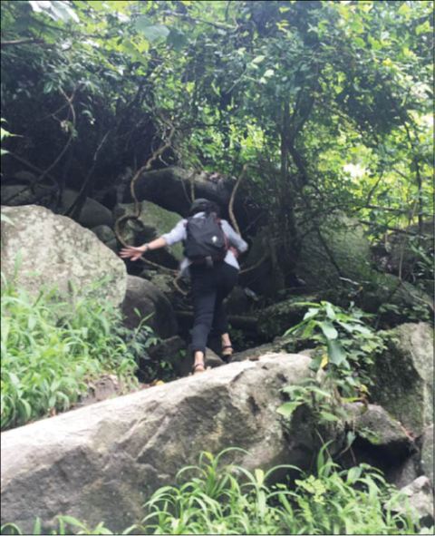 Vậy là tôi bám theo Thư. Mồ hôi bắt đầu túa ra khi đường khó dần. Qua hết 385 bậc bằng đá chẻ và một cơ số đoạn lổn nhổn đá to đá nhỏ, chúng tôi bắt đầu tiếp cận con đường mòn giữa đá. Gọi là đường mòn cho oách thôi chứ thực ra mắt phải liên tục ước chừng nên đặt chân, đặt tay mình vào đâu giữa các gờ đá mấp mô. Tối qua núi Bà có mưa nên nước vẫn còn lớp nhớp dưới các kè đá trơn rêu. Con đường chạy giữa cây rừng thi thoảng mới có vài bóng nắng lỗ đỗ. Ba lô một lúc một trĩu trên vai và áo đã không còn chỗ để ướt nữa. May mà một vài đoạn đá phẳng dài người ta đã chôn dây thừng cho mình nắm níu, không thì chả biết xoay xở thế nào với đôi chân nghiệp dư, quen ngồi bàn giấy và cứ tưởng đi bộ mỗi sáng được vài km là nhất rồi.