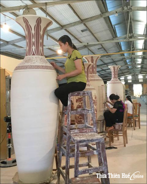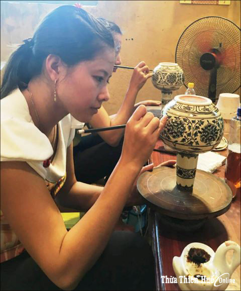 Ở phía sau khoảng lặng lẽ mà cuốn dụ ấy, là xưởng vẽ của những người thợ trẻ. Không biết có phải công đoạn này cần sự cẩn trọng và nhẹ nhàng không mà thấy họ đa phần là nữ, và cơ bản là trẻ. Những chiếc bình gốm, bát hương, hình các linh vật... chưa qua lớp nung đặt các kiểu thuận, nghịch trên bàn xoay. Không mấy tiếng chuyện trò, mọi người miệt mài và chú mục trên từng thân gốm chưa nung. Những chiếc bút vẽ trên bàn, trên tay. Những màu mực xanh, nâu, chàm, tía… trong những chiếc bát sứ lặng lẽ vơi dần khi những đường nét mỗi lúc một hiện rõ. Và cho dù các sản phẩm gần như đã được hiện đại hóa theo dây chuyền, nhưng những nét vẽ trên mỗi đơn vị gốm đều được vẽ tay một cách tỷ mỷ. Thế nên cho dù một số sản phẩm nào đó mang form và đường nét giống nhau, ít nhất thì những người thợ sẽ nhận ra những đường nét của mình, với những yêu thương, vui buồn trên từng nét vẽ. Tôi đã nghĩ thế khi quan sát những đôi mắt chăm chú, những bàn tay mềm mại mà miệt mài. Kể cả những cái bặm môi hay những lúc vươn tay xóa đi những giọt mồ hôi trên gương mặt, hay lúc ai đó ngừng tay vén gọn lại mái tóc và một ánh nhìn nào đó chợt nhiên có đôi chút xa xôi…