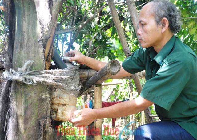 Đến nhà “nghệ nhân” Hồ Nhật Tân, ngỏ ý muốn tìm hiểu về rượu Tà Vạt, ông cười đon đả: “Uống rồi mới viết được nhé!”. Nói đoạn, ông ra sau vườn, trèo lên thang cẩn thận xách can nhựa chứa thứ nước màu trắng đục như sữa xuống, rót vào bát mời khách. Nhấp một ngụm, cảm nhận được sự nồng nàn của thứ “men trời”, chút thanh tao dịu ngọt đầu lưỡi. Ông Tân bảo, với người Tà Ôi, khách quý đến nhà mới được thết đãi thứ rượu truyền thống này. Xung quanh nhà ông, cơ man nào là cây đoác, đùng đình dùng để khai thác rượu.