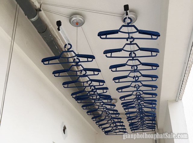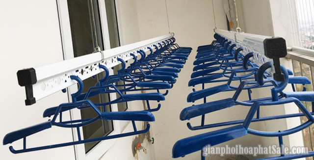 Mẫu giàn phơi này có thiết kế đẹp, gọn gàng cực kỳ phù hợp lắp đặt ở chung cư, nhà phố. 1 bộ giàn phơi có 2 thanh dài 2,2m có thể nâng cao lên sát trần hoặc hạ thấp vừa tầm với theo sự điều khiển của người dùng.
