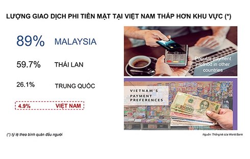 Theo thống kê của Ngân hàng thế giới (WB), Việt Nam có lượng giao dịch phi tiền mặt thấp nhất trong khu vực chỉ đạt 4,9%; trong khi tỷ lệ này ở Trung Quốc là 26,1%; Thái Lan là 59,7% và Malaysia là 89%. Mặc dù, thương mại điện tử tại Việt Nam có mức phát triển thuộc top nhanh nhất trong khu vực, tuy nhiên, tỷ lệ thanh toán online rất thấp.