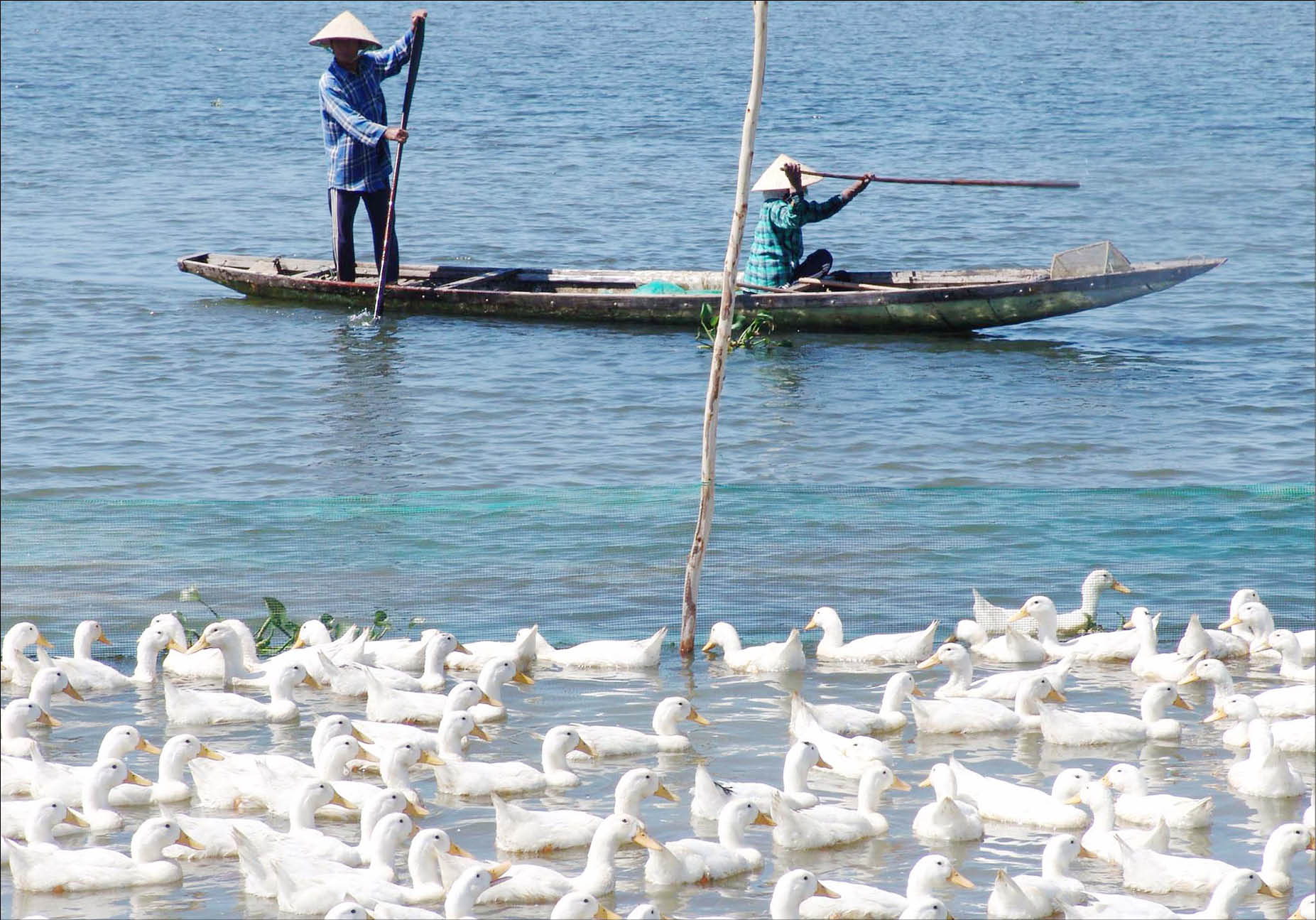 Chủ trại vịt hơn ngàn con của ông Phan Xuân ở cuối hạ lưu sông Hương, thuộc xã Hương Phong cũng đang phát triển tốt, an toàn dịch bệnh. Điều ông Xuân quan tâm nhất về quy trình nuôi thủy cầm an toàn, là ngoài yếu tố vị trí chăn nuôi phù hợp, còn phải chú trọng việc chấp hành tiêm vắc xin cho gia cầm, tiêu độc khử trùng chuồng trại. “Ngay từ những ngày đầu nuôi, được sự hỗ trợ của cán bộ thú y, gia đình tôi đã tổ chức tiêm vắc xin đầy đủ cho đàn vịt. Cùng với đó là tuân thủ quy định phun thuốc phòng ngừa dịch bệnh quanh khu vực nuôi, mỗi tuần một đến hai lần”, ông Xuân chia sẻ. Ngoài trại nuôi trên, tại khu vực hạ lưu sông Hương, thuộc xã Hương Phong còn có khoảng 5 trại nuôi vịt quy mô ngàn con trở lên đang phát triển tốt, sắp xuất bán phục vụ dịp Tết Đoan ngọ.
