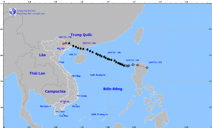 Lúc 19 giờ ngày 18/7, vị trí vùng áp thấp ở khoảng 22,2 độ Vĩ Bắc; 106,5 độ Kinh Đông. Sức gió mạnh nhất ở vùng trung tâm áp thấp dưới cấp 6.