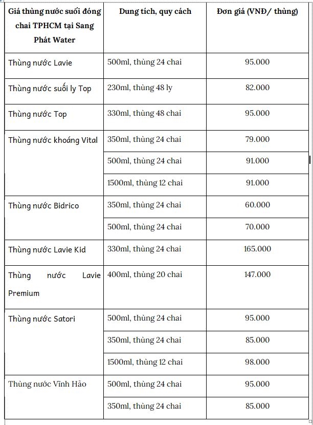 Giá nước suối đóng chai tùy thuộc vào nhiều yếu tố: thương hiệu, dung tích chai nước, đại lý phân phối,... Dưới đây là bảng giá thùng nước suối đóng chai mới nhất tại TPHCM, bạn có thể tham khảo: