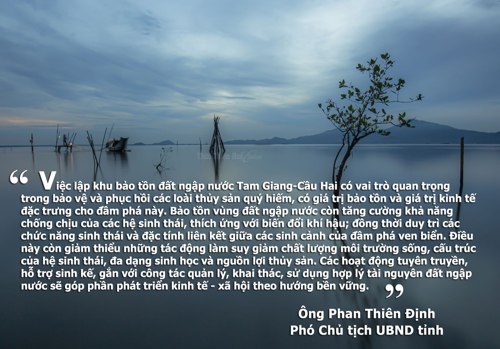 Rú Chá là câu chuyện điển hình về một điểm đất ngập mặn được chính người dân giữ gìn phát triển. Để bảo vệ nguồn lợi lâu dài và đa dạng sinh học vùng đất ngập nước Tam Giang-Cầu Hai, nhiều năm qua, 25 khu bảo vệ thủy sản nghiêm ngặt đã được tỉnh thành lập.