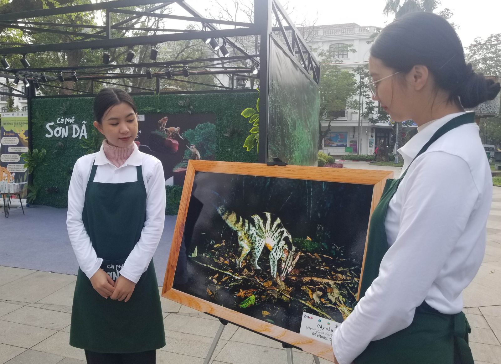 Hoạt động triển lãm tranh về ĐVHD để quảng bá và truyền thông lưu động tại khu vực thành thị thông qua hoạt động trải nghiệm mô hình Cà phê Sơn Dã diễn ra tại công viên Tứ Tượng, đường Lê Lợi (TP. Huế).