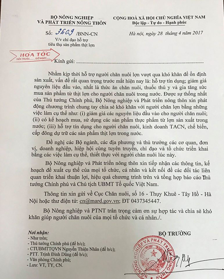 Công văn tiếp nhận ý kiến về giải cứu thịt lợn