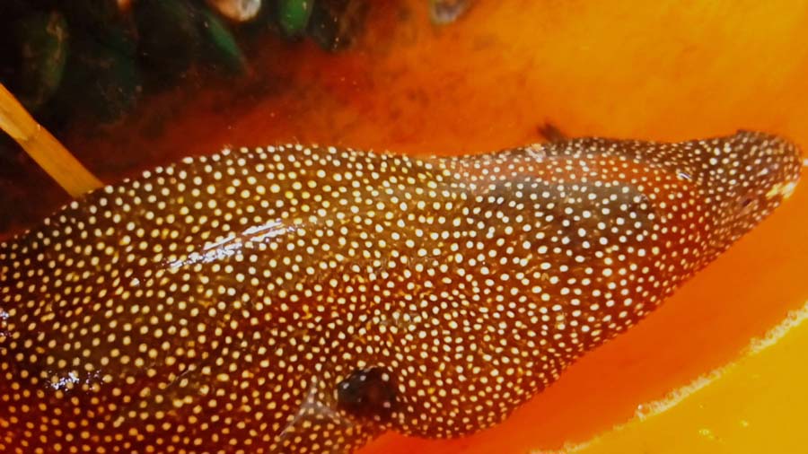 Anh Trần Minh Vũ, chủ quán Hòn Đá, người đang sở hữu con cá chình nói trên cho biết, để tạo nguồn ẩm thực phục khách, vài ngày trước, anh mua được một cặp cá chình, cả hai đều có hình thù khá lạ, nhất là con “cá chình bông biển” màu đen chấm trắng.