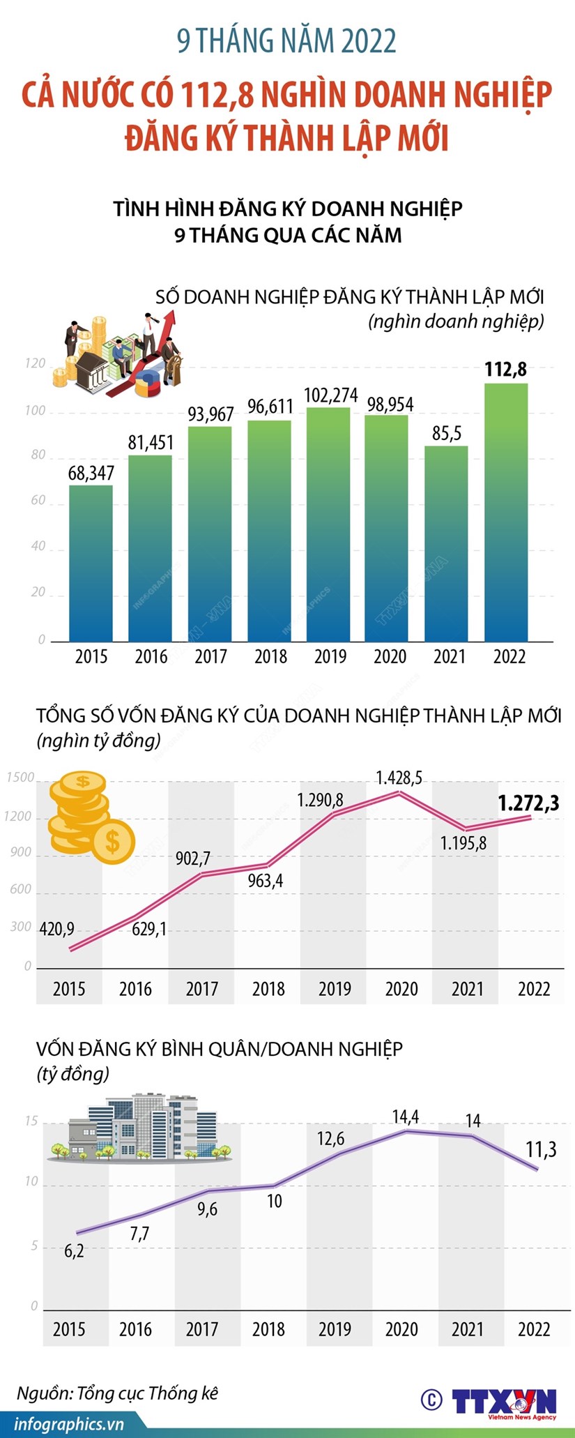 Trong 9 tháng năm 2022, cả nước có 112.800 doanh nghiệp đăng ký thành lập mới với tổng số vốn đăng ký là 1.272,3 nghìn tỷ đồng, tăng 31,9% về số doanh nghiệp, tăng 6,4% về vốn đăng ký so với cùng kỳ năm 2021.