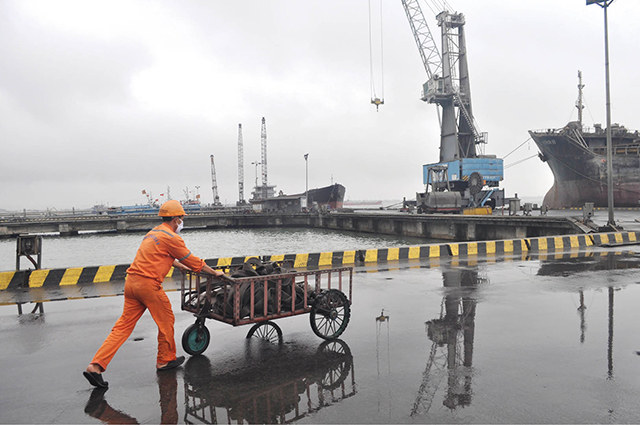 Hoạt động bốc xếp hàng hóa lên xuống tàu được thực hiện khẩn trương tại Cảng Chân Mây