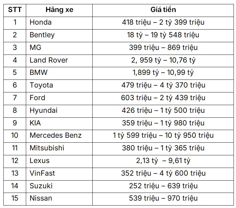 Thị trường ô tô tại Việt Nam ngày càng phát triển với nhiều mẫu xe từ bình dân cho đến cao cấp. Nếu bạn đang tìm kiếm một chiếc ô tô phù hợp, hãy tham khảo bảng giá xe dưới đây: