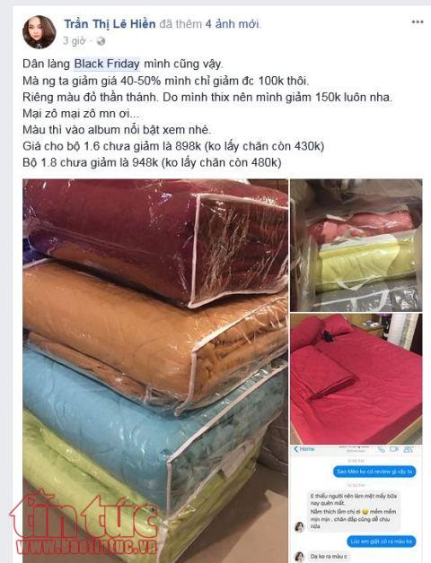 Không chỉ các trang bán hàng online chuyên nghiệp đón đầu ngày Black Friday mà các "chuyên gia" bán hàng qua Facebook cũng "bắt sóng" rất nhanh. Chị Trần Lê Hiền (quận 4, TP Hồ Chí Minh) bán chăn ga gối đệm qua Facebook cho biết: "Nhân dịp này mình cũng giảm giá các sản phẩm chăn ga gối. Và mình giảm thực chất chứ không phải tăng giá lên rồi giảm".