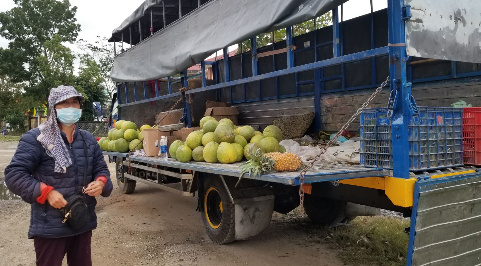Chị Hoà, ở Lương Quán, phường Thủy Biều, TP. Huế mấy ngày nay cũng phụ bán với vợ chồng người em tại hai điểm ở đường Lê Ngô Cát và đường Bùi Thị Xuân các mặt hàng trái cây như bưởi da xanh, chuối, thơm, thanh long... được chở từ miền Nam ra. Tính toán còn một ngày nữa là đón giao thừa, chị Hoà đon đả mời khách mua hàng với mức giá "bán đổ bán tháo". Chị Hoà nói: "Vợ chồng người em ở Bình Dương đánh xe tải ra thăm quê, tiện thể chở hàng ra bán, nên giá mềm hơn so với mấy chỗ khác là cái chắc". Đúng như lời chị Hoà quảng cáo, bưởi da xanh ở hàng chị giờ chỉ bán với giá 20 ngàn đồng/kg, trong khi những hàng quán khác có giá 38 ngàn/kg loại trái to.