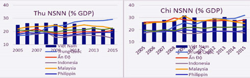 Trong khi đó, tỷ lệ thu ngân sách/GDP của Việt Nam đang liên tục suy giảm qua các năm. Nếu như giai đoạn 2006-2010, thu NSNN ước đạt 28,7% GDP thì giai đoạn 2011-2015 giảm chỉ còn 23,3%. Năm 2016, tỷ lệ ước tính chỉ còn 22,1%.