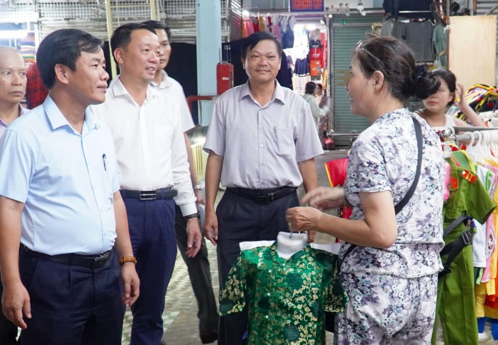 Chủ tịch UBND tỉnh Nguyễn Văn Phương (bên trái) thăm hỏi tiểu thương chợ Đông Ba