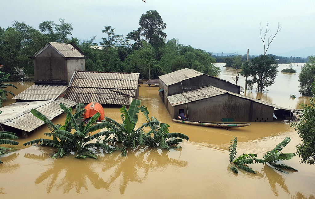 Nước còn ngập đến nóc nhà ở khu vực cầu Phò Trạch, thị trấn Phong Điền