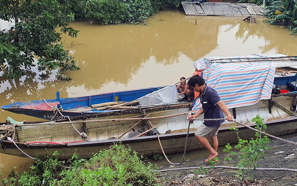 Nhà ngập nên người dân di chuyển lên đò để sinh hoạt