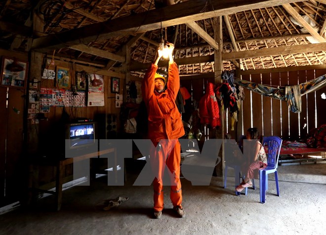 Công nhân Công ty Điện lực Thái Nguyên lắp đèn tiết kiệm điện và hướng dẫn người dân sử dụng điện an toàn. (Ảnh: Ngọc Hà/TTXVN)