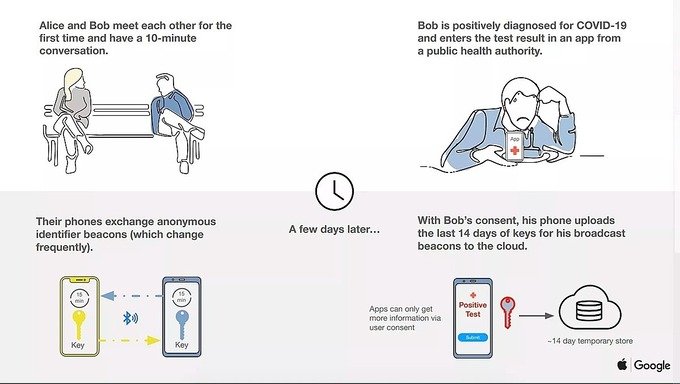 Tháng 5 tới, Apple và Google sẽ phát hành API, cho phép thiết bị chạy Android và iOS tương tác với nhau qua các ứng dụng của các cơ quan y tế công cộng. Giải pháp của Apple và Google không định danh người dùng, chỉ lưu lại vị trí của nhau khi ở gần 5 phút. Nếu một người bị dương tính vớiCovid-19, hệ thống sẽ thông báo với những người có smartphone từng ở trong phạm vi gần với smartphone của người nhiễm.