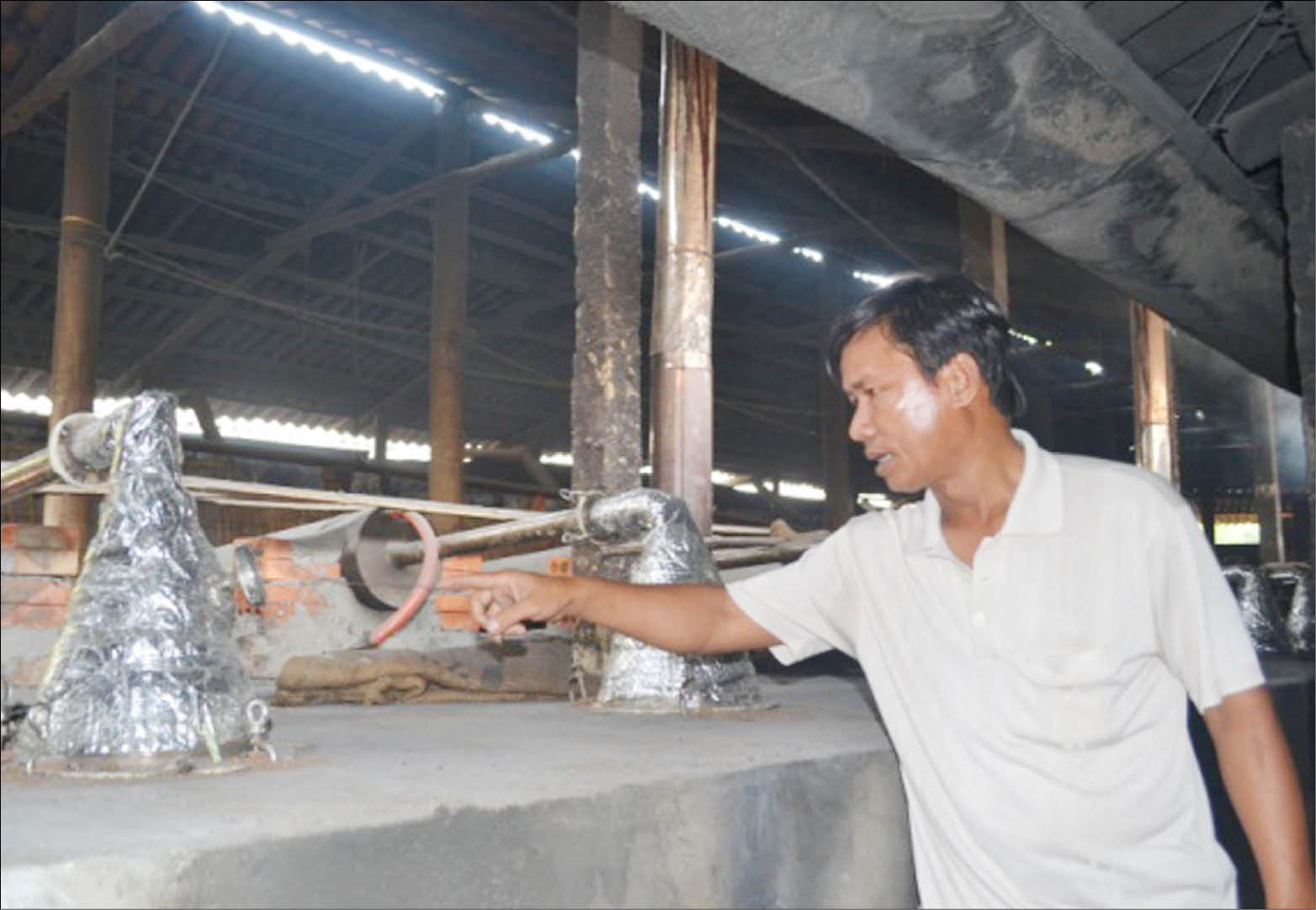 Sau một hồi vòng vo, chúng tôi mạnh dạn hỏi thẳng công đoạn nấu tinh dầu trầm. Ông Diệm dắt chúng tôi xuống khu vực nấu dầu. “Không phải ai cũng được vô đây. Nghề chi cũng có bí quyết riêng của nó. Lộ bí quyết là mất nghề như chơi”. Nói rồi ông Diệm giải thích, 40 lò nấu tinh dầu được xây thành hai hàng dài đối diện nhau, kiểu gần như lò nấu rượu nhưng công phu hơn nhiều. Mỗi lò được xây riêng biệt, gồm có lò nấu than phía dưới kết thông với thùng nấu, phía trên có vòi dẫn khí ra ngoài qua thùng chứa nước. Trầm sau khi được xay, ngâm nước 2 tuần được đưa vào nồi nấu.