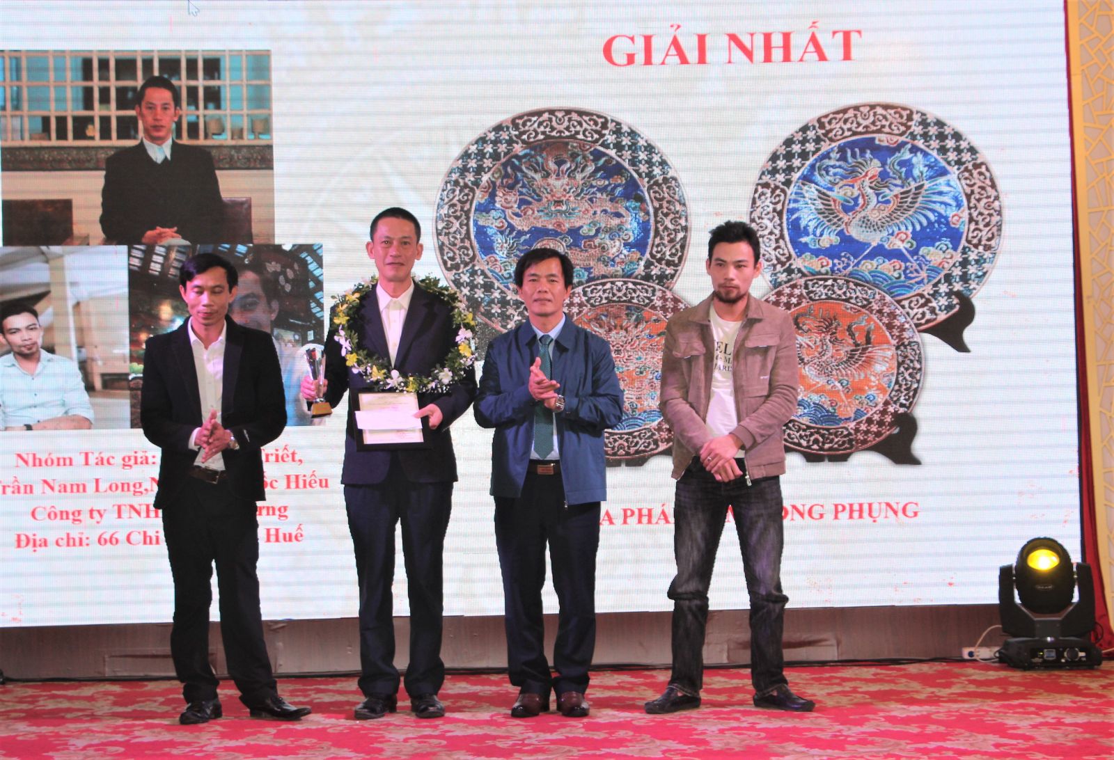 Trong đó, bộ đĩa pháp lam Long Phụng của nhóm tác giả Đỗ Hữu Triết - Trần Nam Long - Nguyễn Quốc Hiếu đạt giải Nhất. 2 giải Nhì thuộc về bộ quà lưu niệm ”Bình phong” đặc trưng Huế của Phạm Đăng Nhật Thái ở 26 Võ Thị Sáu và bộ áo dài Huế lấy ý tưởng từ nghệ thuật điêu khắc trang trí trên kiến trúc Huế của Công ty TNHH MTV Viết Bảo QB; 3 giải Ba gồm: Bộ lắp ráp mô hình giấy 3D Ngọ Môn Huế của tác giả Lê Ngọc Tuấn Anh, bộ khay và tấm trải gia dụng “Kết nối tinh hoa làng nghề Huế” của nhóm tác giả Nguyễn Văn Đủ - Nguyễn Thị Thanh Trà và bộ sản phẩm đèn diều Huế của tác giả Nguyễn Văn Hoàng.