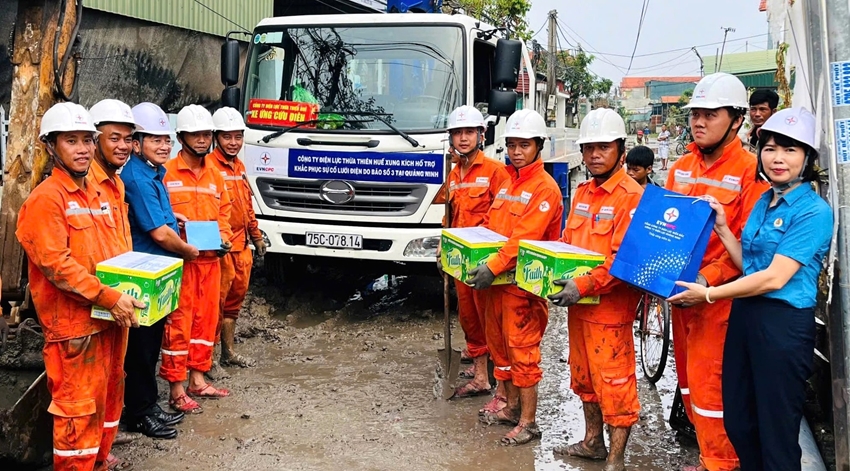 | Anh Đoàn (thứ tư từ phải sang) tham gia khắc phục lưới điện do bão số 3 Yagi tại Quảng Ninh được PC Quảng Ninh thăm, động viên |