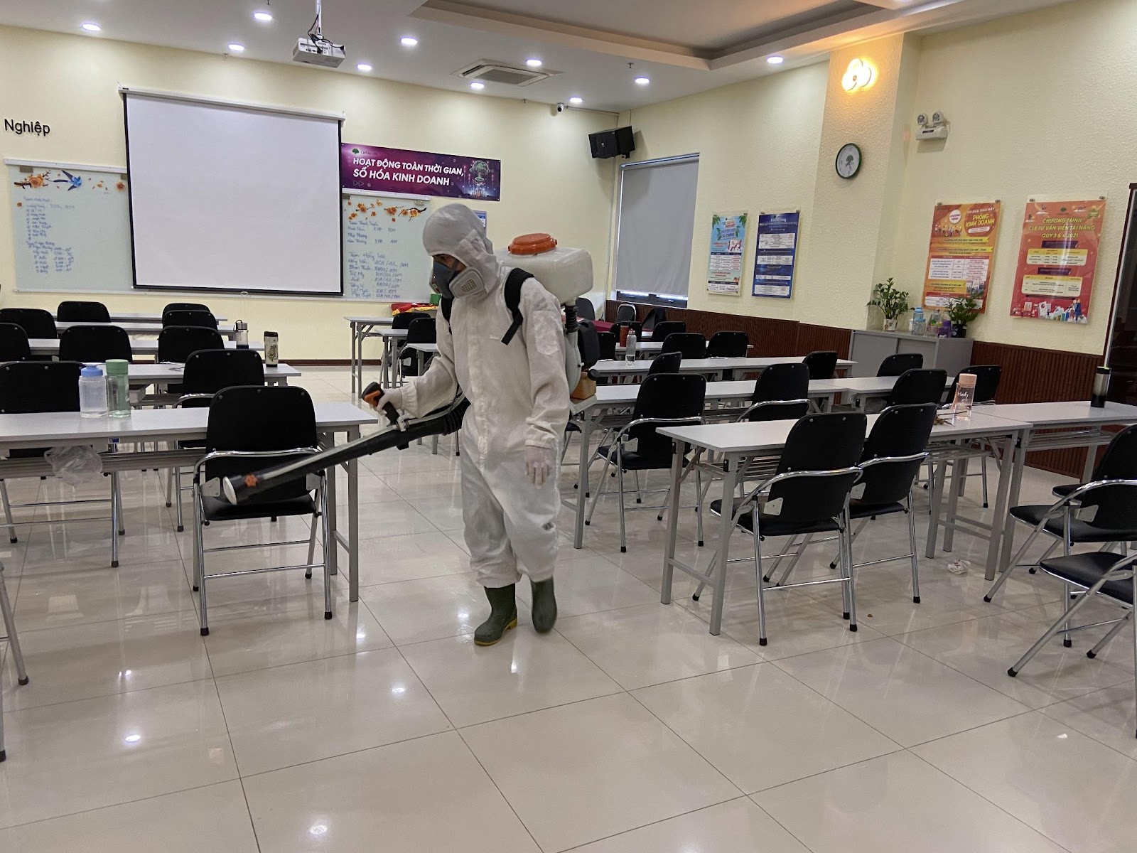 - Trang bị đầy đủ thiết bị khử khuẩn hiện đại, đáp ứng quy mô diện tích lớn. Máy phun khử khuẩn hiện đại, ULV Fogger, phun tĩnh điện, không làm bẩn ướt trong quá trình phun, không ảnh hưởng giấy tờ, thiết bị điện tử