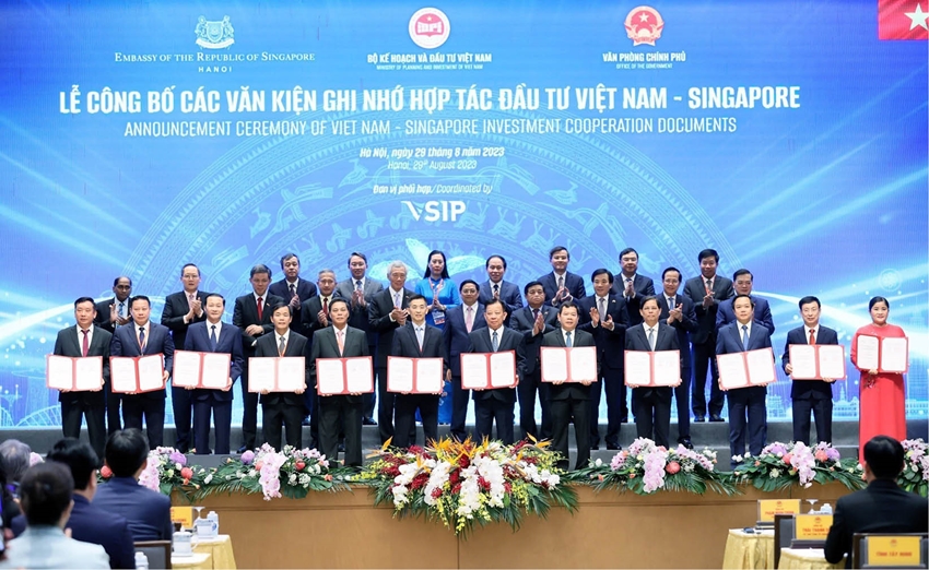 | Chủ tịch UBND tỉnh Nguyễn Văn Phương (hàng dưới, thứ tư từ trái sang) tham dự lễ công bố các văn kiện ghi nhớ Hợp tác Đầu tư Việt Nam – Singapore vào ngày 29/8. Ảnh: UBND tỉnh cung cấp |
