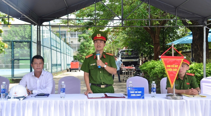 | Đồng chí Lê Chí Thành, Phó Trưởng phòng Cảnh sát PCCC-CNCH chỉ huy lực lượng tại buổi diễn tập |