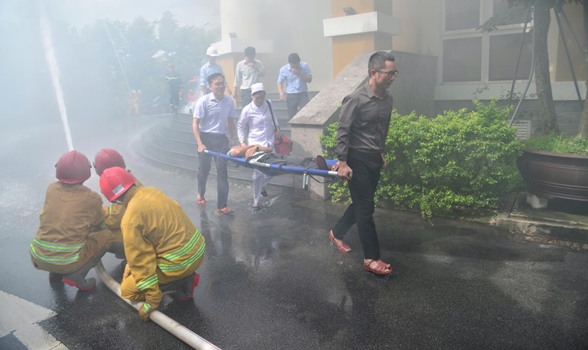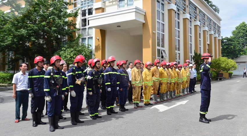 Với tình huống giả định: Khoảng 9 giờ sáng xảy ra cháy tại tầng hầm tòa nhà do sự cố chập điện. Đám cháy lan nhanh, sinh ra nhiều khói, khí độc, khiến hàng chục CBCNV mắc kẹt trong khu vực nguy hiểm. Ngay khi phát hiện cháy, lực lượng PCCC cơ sở đã triển khai báo động, sơ tán người, di chuyển tài sản, tổ chức chữa cháy ban đầu bằng bình CO₂, MFZ và họng nước vách tường. Tuy nhiên, do đám cháy lan rộng và có nhiều nạn nhân mắc kẹt, lực lượng cơ sở nhanh chóng báo cáo Ban Giám đốc, đồng thời gọi số 114 đề nghị hỗ trợ.