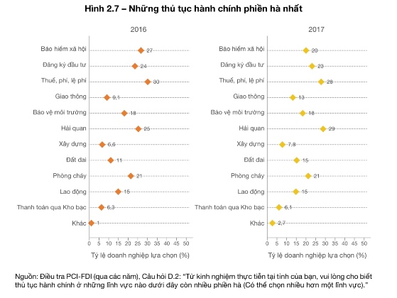 Theo điều tra PCI 2017, các DN FDI cho rằng, các thủ tục thuế (28%) và hải quan (29%) vẫn là những lĩnh vực thủ tục bị đánh giá là phiền hà và gây tốn kém nhất đối với các nhà đầu tư nước ngoài tại Việt Nam. Tiếp đó, lĩnh vực bảo hiểm xã hội, từng đứng thứ hai trong danh mục phiền hà năm 2016, năm nay đã có sự cải thiện đáng kể. Thành tựu này được cho là nhờ những nỗ lực cải cách hành chính gần đây khi Bảo hiểm Xã hội Việt Nam đã cắt giảm còn 32 thủ tục hành chính và giảm 54% quy trình, thao tác thực hiện.
