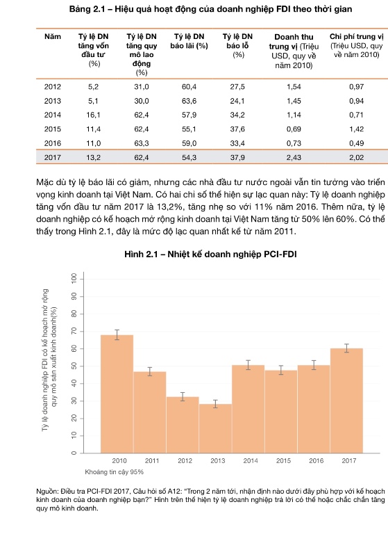 Theo báo cáo PCI 2017, tỷ lệ doanh nghiệp (DN) FDI báo lỗ tăng kỷ lục, nhưng tỷ lệ DN có kế hoạch mở rộng kinh doanh tại Việt Nam và tăng vốn đầu tư năm 2017 vẫn tăng nhẹ. Đánh giá của các DN FDI, các thủ tục hành chính đã có những thay đổi tích cực để hỗ trợ DN.