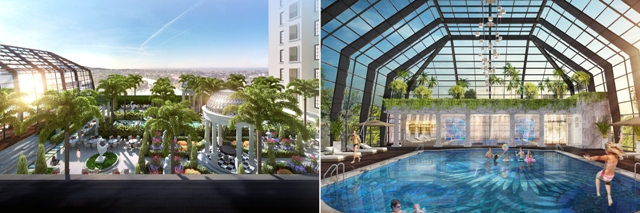 Trong đó, điểm nhấn đặc biệt của The Manor Crown Tower là hồ bơi trung tâm bốn mùa với mái vòm màu xanh được sắp đặt, thiết kế cảnh quan và ánh sáng ở chính giữa khu vực tầng 6 như một viên ngọc trên chiếc vương miện của nhà vua.
