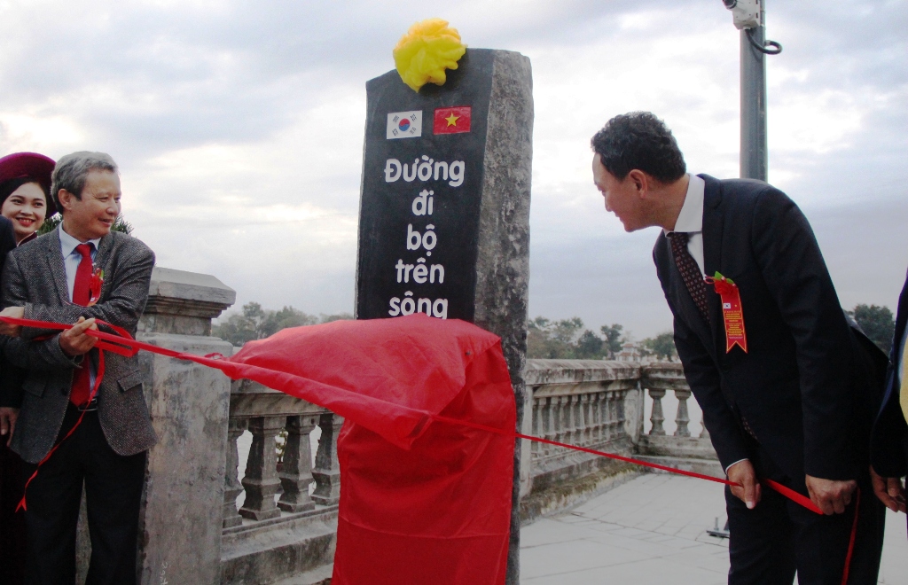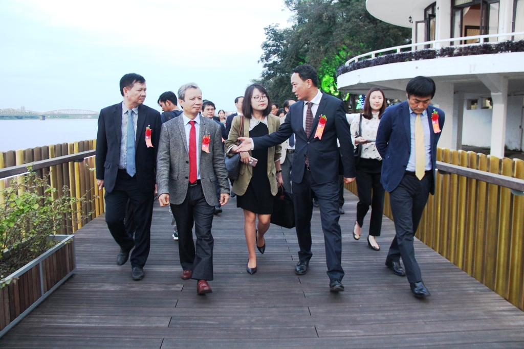 Ông Lê Trường Lưu, Uỷ viên Trung ương Đảng, Bí thư Tỉnh uỷ, Chủ tịch HĐND tỉnh (thứ 2 từ trái) cùng các đại biểu đến từ Hàn Quốc đi dạo trên đường đi bộ dọc sông Hương sau lễ khánh thành