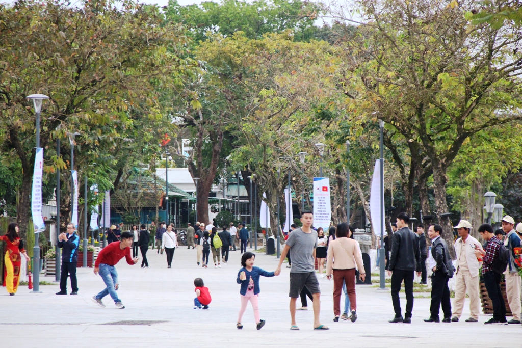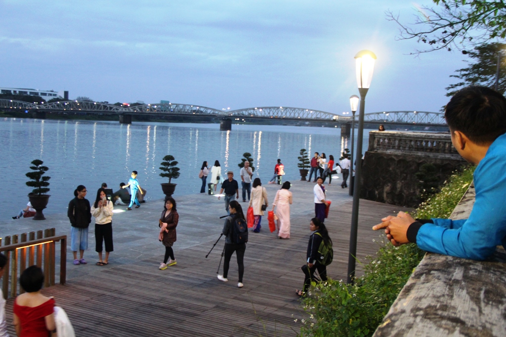 Rất đông du khách, người dân cùng đi bộ vui chơi ở dưới đường đi bộ dọc sông Hương