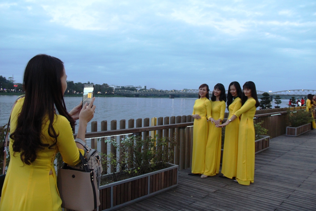 Các đại biểu cùng nhau chụp hình lưu niệm ngay trên đường đi bộ dọc sông Hương