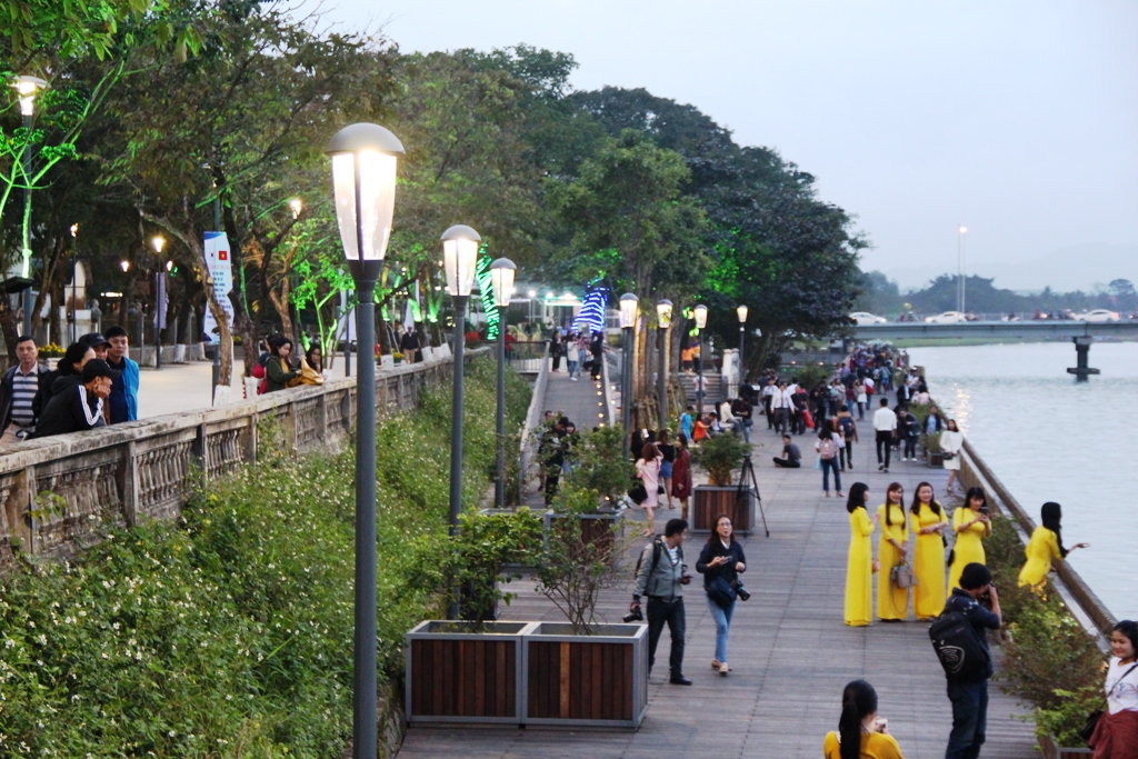 Cùng với đường đi bộ dọc sông Hương, tuyến đường ở phía trên đó cũng được chỉnh trang, tạo một không gian mới, giữa lòng TP. Huế