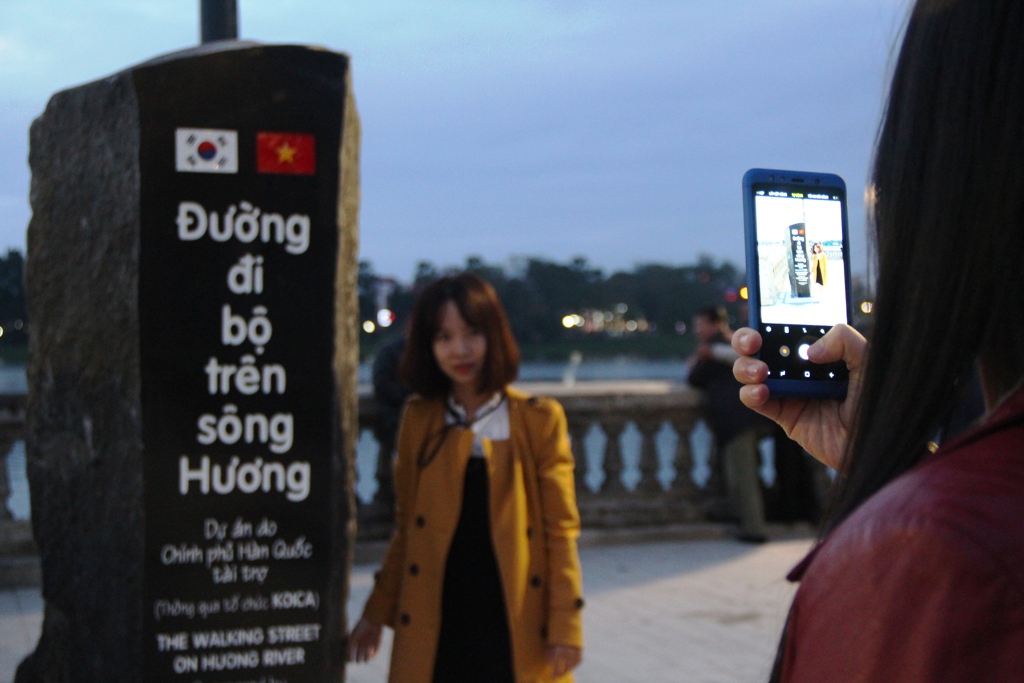 Tạo dáng bên đường đi bộ dọc sông Hương
