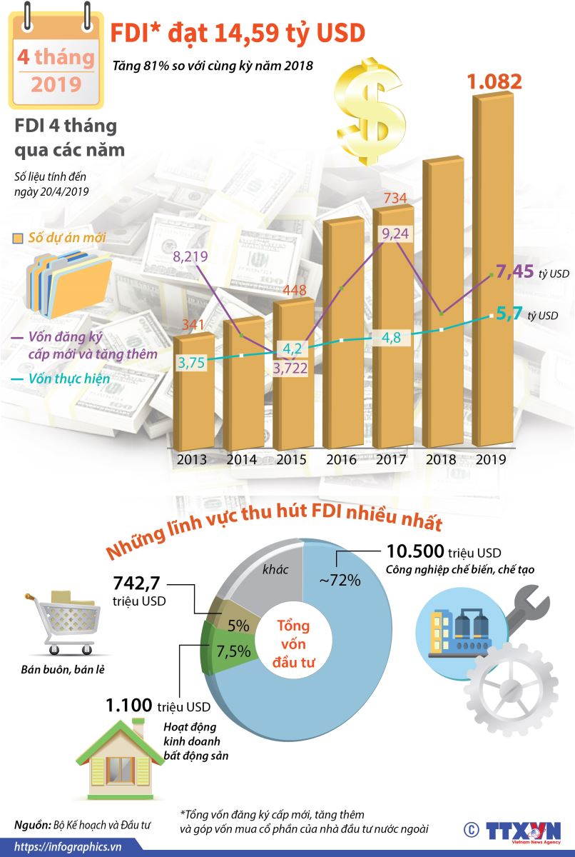 Bốn tháng năm 2019, tổng vốn đăng ký cấp mới, tăng thêm và góp vốn mua cổ phần của nhà đầu tư nước ngoài (FDI) vào Việt Nam đạt 14,59 tỷ USD, tăng 81% so với cùng kỳ năm 2018.