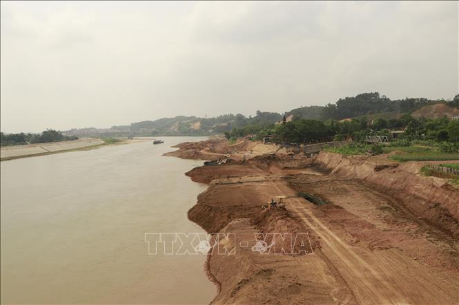 Dự án kè hai bên bờ sông Hồng (đoạn chảy qua thành phố Yên Bái) là một trong những dự án trọng điểm có tiến độ giải ngân cao đang được gấp rút thi công. Ảnh: TTXVN