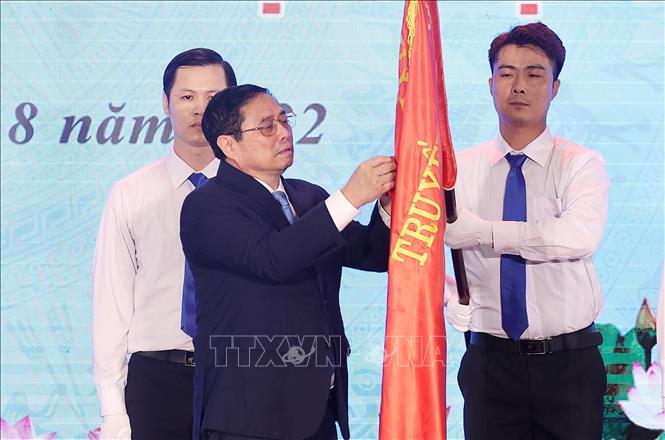 Thủ tướng Phạm Minh Chính gắn Huân chương Lao động hạng Nhất lên cờ truyền thống của Bộ Tài nguyên và Môi trường. Ảnh: Dương Giang/TTXVN