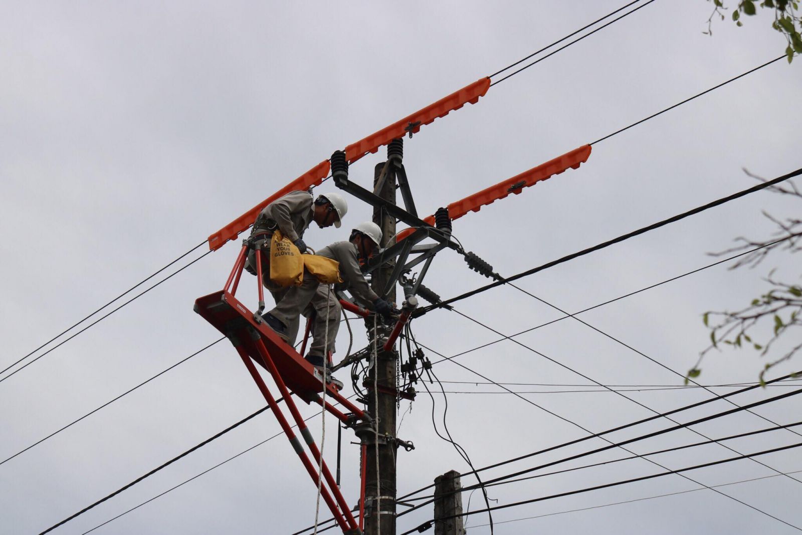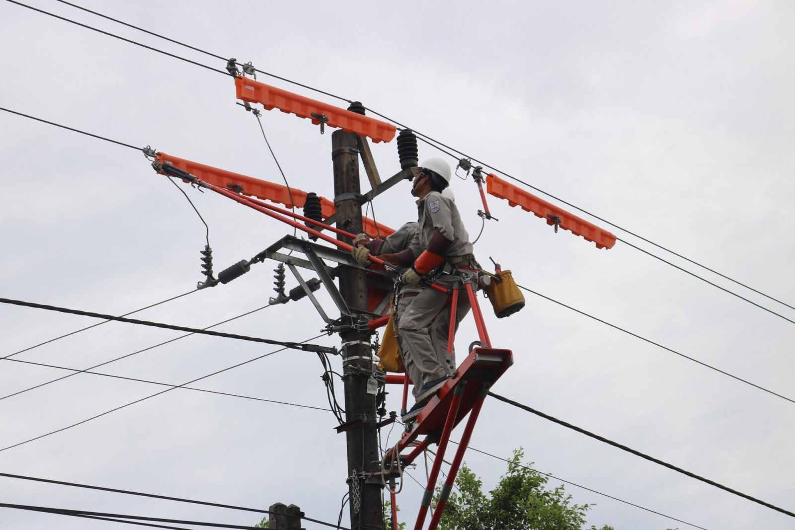 Công nhân điện lực đang thao tác sửa chữa điện nóng trên đường dây 22kV